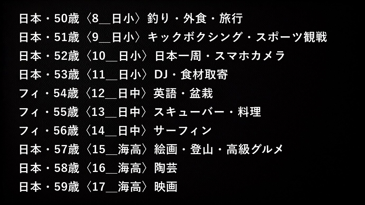 次は趣味。50歳の一年は、釣りとランチと旅行になる。趣味は事前にスケジュール化する事がとても大切だった。行くことを前提とした生活をしないと、結局流れてしまうからだ。そして、自分の事をもっと大切に楽しませてあげる事に気付いた。20代からを振り返った50歳の誕生日。アパホテルで一人、思考したノートを見返しても良いし思い返しても良いが、20代から水商売を行ってから自分を楽しませるプライベートが無くなってしまっていた。水商売前は毎日が楽しくて刺激的な生活なので話題も多かったが、最近は仕事以外で何も知らない。なので、趣味が必要と考えた。理想の生活も遊び8割、仕事2割なので今から必須だよね。