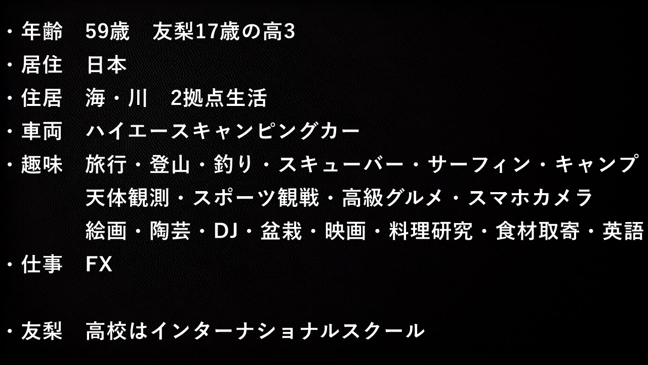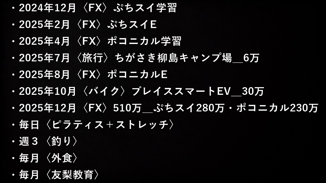 2025年の趣味や友梨の習い事は以上になるが、楽しい生活をするためには資金がいる。仕事はFXトレードだ。2025年の年間収益はザっと4~500万程度になるが、途中で引き出せないので初年度になるこの1年はお金をあまり使えない。ただ、2026年から劇的に資金面は楽になるのでこの1年を乗り越えよう。収益までの流れは、まず2024年の12月から本格的にぷちスイングの学習をスタートさせる。そして、2025年の2月よりエントリー開始だ。学習期間は2ヵ月。そのままぷちスイの学習を継続させて、4月よりポコニカルの学習に移行する。ポコニカルの学習中もぷちスイ朝のシナリオ作りなどの学習は継続し、4時間足で時間があるぷちスイの余力時間をポコニカル学習にする流れ。そして、4ヵ月の学習後8月よりポコニカルのエントリーも開始する。8月になれば4時間足ぷちスイング、夕方から23時頃までポコニカルのFX生活になる。2025年の収益はぷちスイが280万円、ポコニカルが230万円で合計510万円になるが、実際に1年間が終わってみないと分からない。ただ、サラリーマンの年収程度は稼ぐことができるので、安心してFXの学習と共にトレードに集中してほしい。とにかくFX1点、FX漬けになる事。